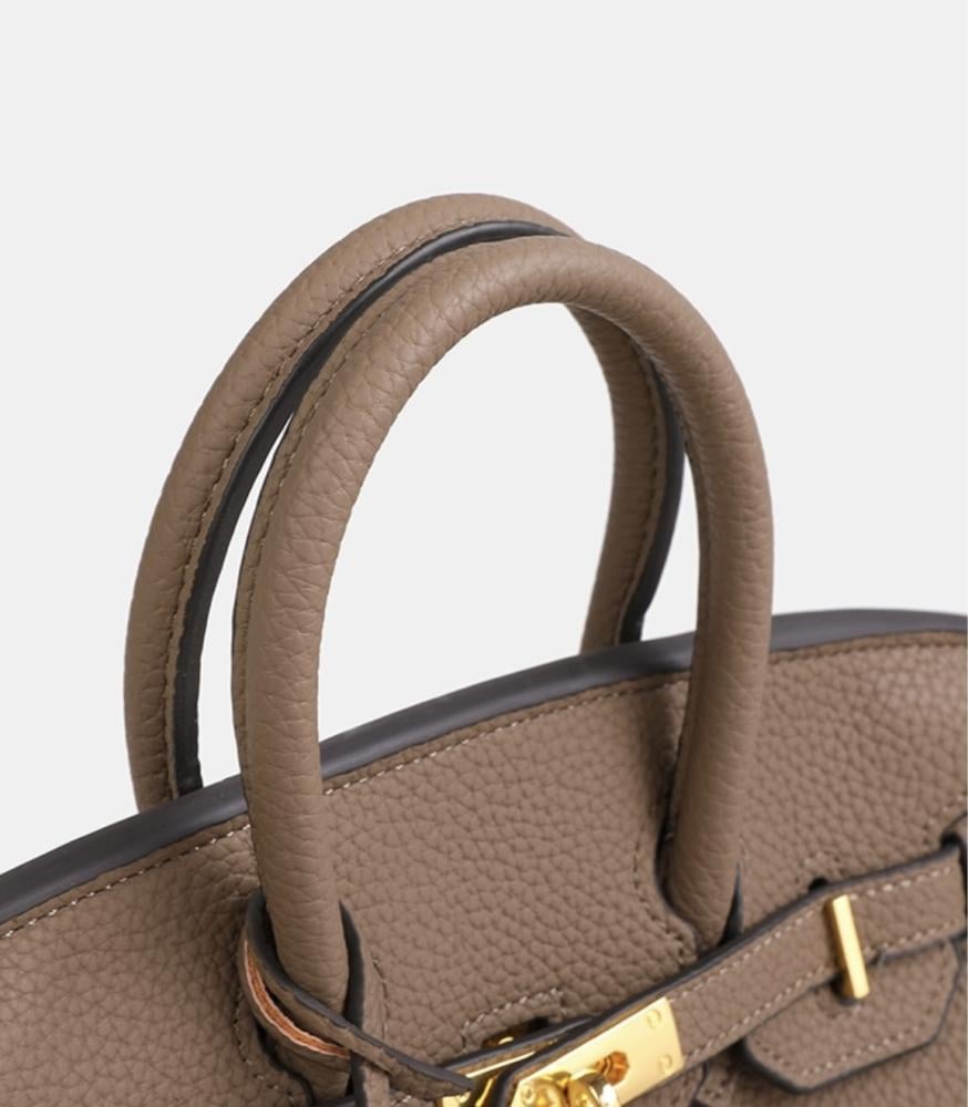 شنطة راقية بلون كاكي كلاسيكي وتصميم مستوحى من حقائب بيركن الشهيرة، تتميز بخامة فاخرة وتفاصيل معدنية ذهبية تضيف لمسة من الفخامة والرقي.